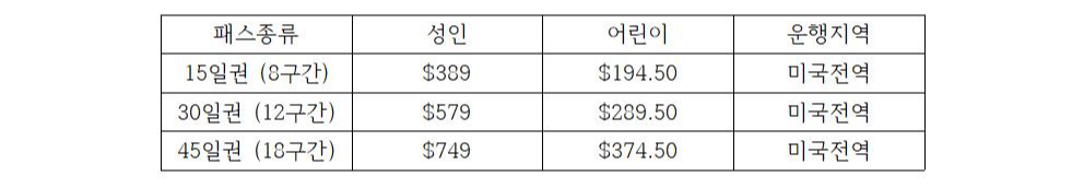 전자티켓이 있어 국내에서도 편리하게 인터넷 구매를 할 수 있고, 암트랙 패스의 종류와 가격은 다음과 같다.