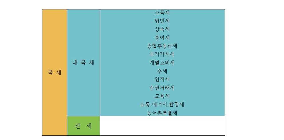 국세는 중앙정부에서 부과·징수하는 세금으로 내국세와 관세로 구분된다.