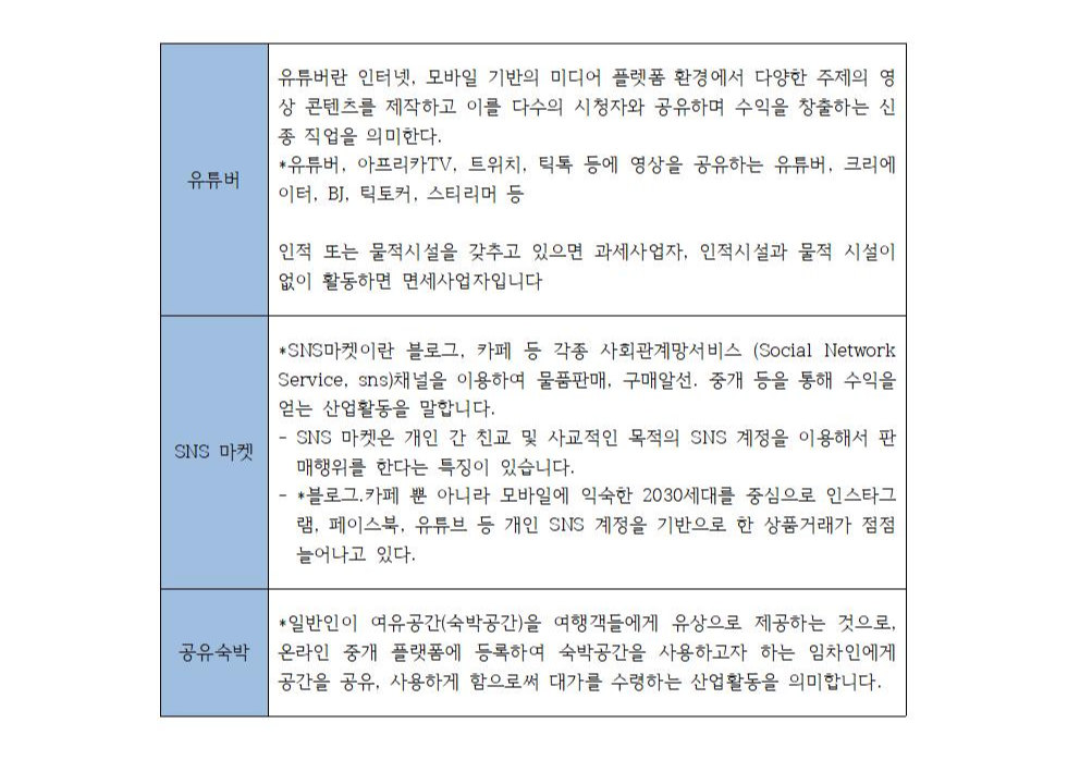 - 인적시설과 물적시설이 없는 1인 미디어 콘텐츠 창작자는 부가가치세가 면제되는 면세사업자입니다.